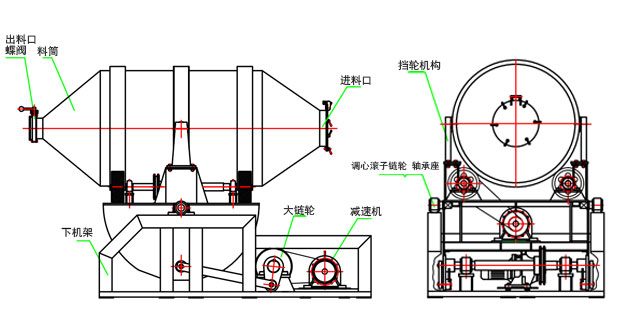 }二维混合机主要是由转筒、舞动架、机架三大部分组成。转筒装在摆架上,由四个滚去撑并由两个挡轮对其进行轴向定位,在四个支撑滚轮中,其中两个传动轮由转动动力系统手动使转筒产生转动,摆动架由一组曲柄摆杆机构驱动,曲柄摆杆机械在机架上,摆动架由承组支撑在机架上。